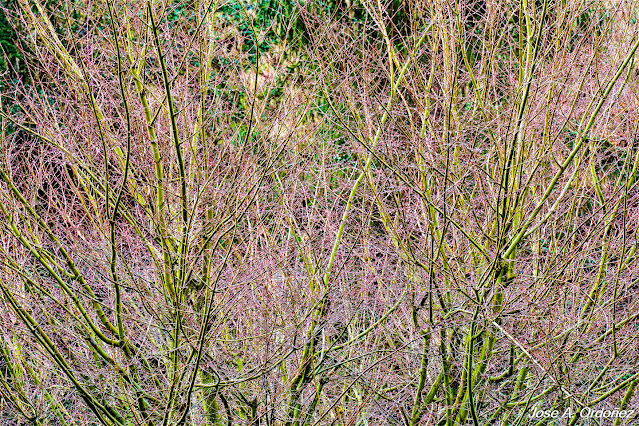 Este brezo necesita más sol para florecer. El nogal de la foto ha sido podado drásticamente. Veremos si cambia el próximo año.