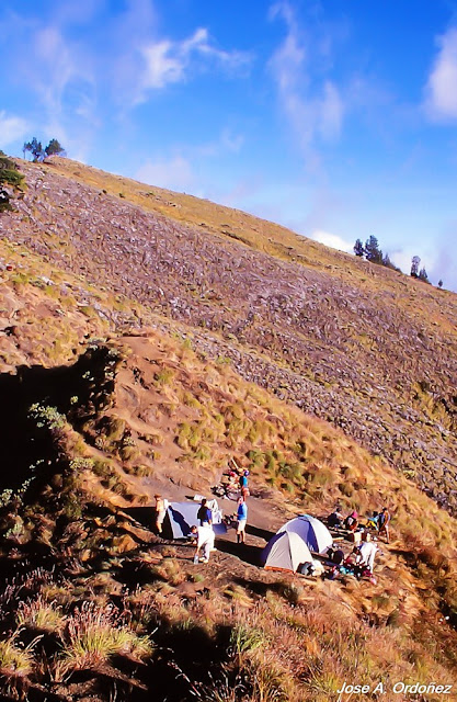 Cruzamos campos de arroz, luego una selva húmeda y extenuante y después bosques de rododendros cubiertos de líquenes. A partir de los 3000 metros desaparece la vegetación y en el mar de nubes despuntan las cabezas de otros volcanes en la cercana isla de Bali. Llegamos extenuados a la cima donde colocamos nuestra tienda y cenamos viendo la puesta de sol más hermosa que haya visto nunca. Al día siguiente descendemos por un estrecho sendero hasta el lago del interior del volcán. La enorme caldera, de 6 por 8 kilómetros, parece un mundo dentro de otro mundo. Otro pequeño volcán en medio del gran lago de aguas azules, bosques de pinos y hasta fuentes de aguas termales donde me baño mientras Bima cocina en un fueguecito de ramas. Parece nervioso y dice que hay que tener cuidado y no se fía de algunos hombres solos que hay pescando en el lago. Dice que ya ha habido varios asaltos a turistas este año. Por si acaso tiene la escopeta a la vista. Todo transcurre sin novedad y a la tarde iniciamos el camino de regreso a la cima donde pasaremos la noche en el mismo lugar, esta vez acompañados de otros turistas que acaban de llegar. Tengo que reconocer que se apaña para hacer una comida deliciosa con muy pocas cosas. Al día siguiente regresamos al hotel sin ningún contratiempo. Estoy tan extenuado que no puedo mover los pies, pero el paisaje ha merecido la pena. Ninguna de estas diapositivas es capaz de transmitir la enorme belleza de aquél espectacular paisaje. Espero que os gusten.